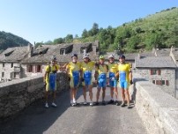 Après les préparatifs nous partons pour sillonner la partie Ouest du Mont Lozère. Nous roulons tranquillement pour profiter du paysage. Pont de Montver, joli petit village ou on se fait photographier par un touriste. Ensuite nous attaquons la montée sur le col de Finiels. La température est agréable. Au village de Finiels certains se demandent s’ils ne vont pas mettre le vélo dans le local poubelle.